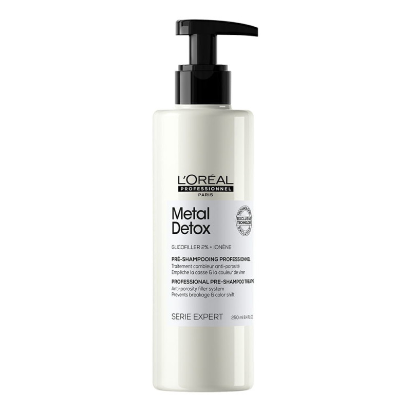 Entgiften Sie Ihr Haar nach dem Färben, Blondieren oder Balayage! Metal Detox Pre-Shampoo Treatment ist eine innovative Behandlung, die Mikrorisse im Haar in nur einer Anwendung repariert, um Porosität entgegenzuwirken und poröses Haar zu stärken und eine übermäßige Wasseraufnahme zu verhindern. Die Formel enthält eine patentierte Technologie, die mit Glicofiller angereichert ist, einem Wirkstoff, der sowohl innerhalb als auch außerhalb der Haarfaser wirkt und eine übermäßige Wasseraufnahme durch Metalle verhindert.