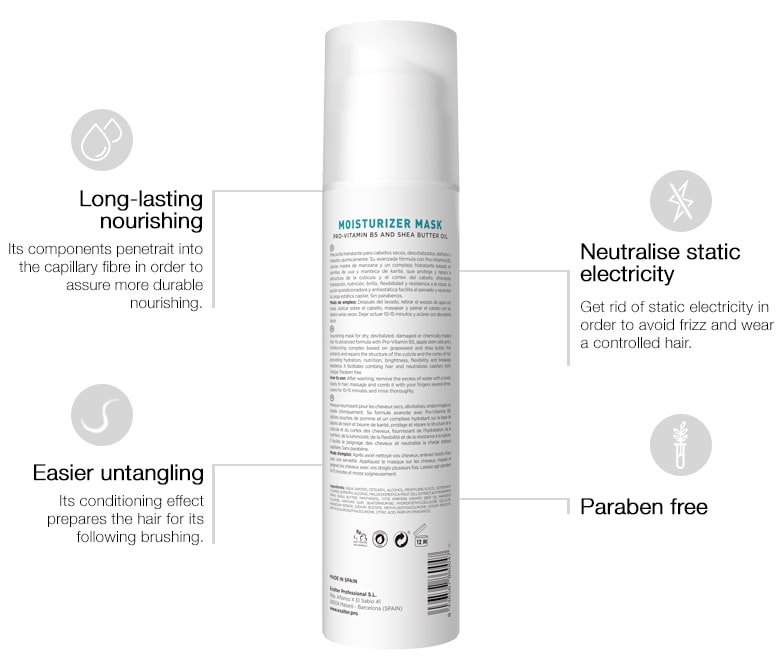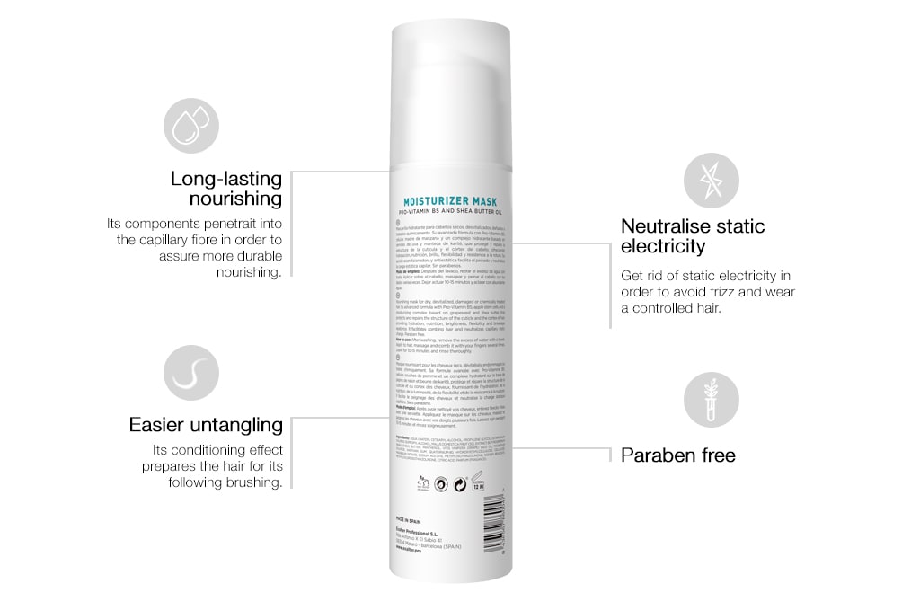 After washing hair with Moisturizer Shampoo, remove excess of water with a towel. Apply a small amount of this mask from mid-lengths and ends and massage it to promote its penetration into the cuticle. Leave on for 10 - 15 minutes. Rinse thoroughly.