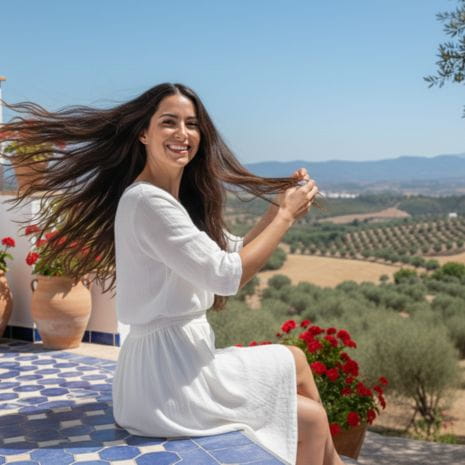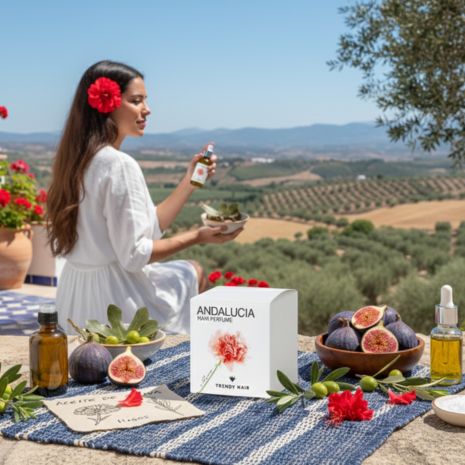 Andalucía Hair Perfume es el spray capilar de Trendy Hair que transforma tu rutina de cuidado en un ritual sensorial. Inspirado en la fragancia Giralda y los aromas mediterráneos, combina notas florales y almizcladas con un fondo natural que envuelve tu cabello de frescura, brillo y suavidad. Su fórmula ultraligera con aceite de oliva y extracto de higo nutre y protege sin apelmazar, aportando movimiento natural y control del encrespamiento.