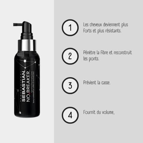 Reconstruisez vos cheveux et prévenez les cassures. No.Breaker est le nouveau venu dans la marque Sebastian : un traitement reconstructeur sans rinçage qui renforce et répare les cheveux. Il pénètre efficacement dans la cuticule du cheveu pour réparer intensivement la fibre capillaire, même sur les cheveux gravement endommagés par l'utilisation d'outils thermiques ou de processus chimiques. De plus, il renforce les cheveux, ce qui évite les cassures.