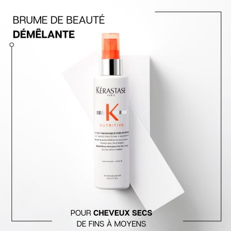 Protégez vos cheveux, améliorez leur apparence ! La Lotion Thermique Sublimatrice est une brume lactée qui nourrit et hydrate intensément les cheveux secs de fins à normaux. Elle facilite le démêlage, conditionne et apporte une douceur intense à la fibre capillaire et la renforce pour lui redonner un aspect maniable, éclatant et soyeux. Cette lotion agit à l'intérieur de la fibre capillaire pour la réparer et la nourrir, tout en renforçant sa barrière protectrice et en prévenant la perte d'humidité. Elle offre également une protection contre les températures élevées résultant de l'utilisation d'outils thermiques (jusqu'à 230°C), réduit les frisottis et prévient efficacement la casse des cheveux.