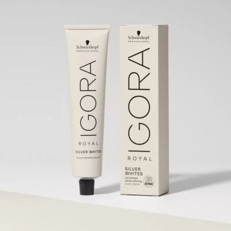 Igora Royal Silver Whites est une crème colorante permanente à faible teneur en ammoniaque et au pH doux, spécialement conçue pour embellir et matifier les cheveux complètement blancs ou naturellement gris, en rehaussant leur brillance et leur texture de manière professionnelle.
