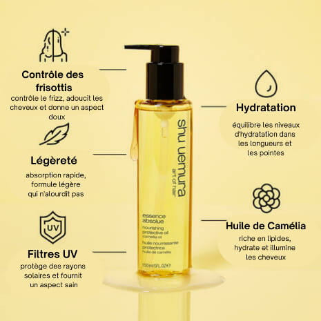 Illuminez vos cheveux instantanément. L’huile traitante Essence Absolue de Shu Uemura est l’huile définitive de beauté pour tous les types de cheveux. Hydrate, régénère, illumine et contrôle les frisottis en un seul geste. En plus, il a un arôme enveloppant et très agréable.