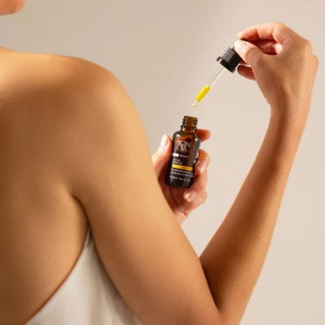 - Chauffez délicatement 3 à 4 gouttes de sérum entre les mains, puis appliquez par pressions légères.