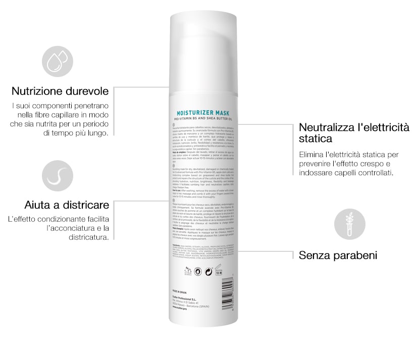 Godetevi di nutrire i vostri capelli secchi. Moisturizer Mask è la maschera più nutriente e idratante della gamma Excellent. Fornisce una nutrizione intensa ai capelli più secchi dalla prima applicazione. Creata in particolare per i capelli più esigenti, infonde una sublime idratazione, controllando l'effetto crespo e rendendo i capelli più resistenti alla rottura. Inoltre, offre assoluta lucentezza e flessibilità anche nei capelli più malnutriti e, grazie alla sua azione condizionante e antistatica, facilita la pettinatura, neutralizzando la carica statica dei capelli. Il suo aroma fruttato lo rende un'esperienza che arricchisce veramente i sensi.