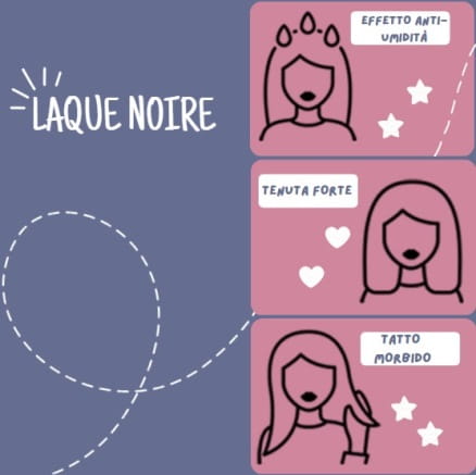 Fissate e illuminate i vostri capelli. Laque Noire fissa e da lucentezza a tutti i tipi di capelli. Controlla il crespo e fornisce fissazione forte senza irrigidire i capelli.